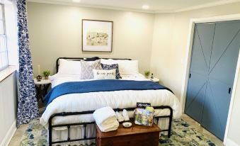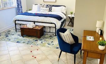 THE SUITE: The cottage is equipped with a large beautifully furnished bedroom complete with a closet, dresser, twin couch bed, desk, phone chargers, luxurious his/her bathrobes, a plush King bed with soft linens along with many pillow options & topped with mints for that special touch.