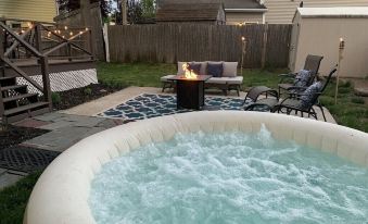 • Outside/Yard - Large deck with propane Weber Grill. Dining set for 6 with umbrella which steps down onto the patio. Patio has fire pit. Just off the patio is the cozy hot tub. At the other end of the yard is a 15' round frame pool perfect for floating around on the rafts or taking a quick dip to cool off!