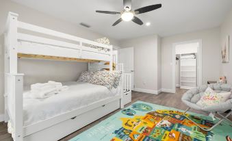 Our home features a spacious living room and three bedrooms, each with their own unique style. Bedroom one is outfitted with a comfortable king bed and plenty of natural light. Bedroom two has a grand king bed, while bedroom three includes two comfy twin beds and a queen(6 adults max).