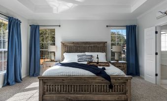 Master bedroom provides top of the line mattress and linens with a relaxing view of the serene backyard and pool. Master bath is spacious and updated with modern fixtures. Soaps and shampoo are provided. Guest bedrooms #2 and #3 each have a queen bed with contemporary lamps attached to headboard, perfect for late night reading. Front bedroom can double as a quiet workspace with desk, lamp and trundle bed that can sleep 2. Large dining area contains a beautiful rustic table and chairs with seating for 8.