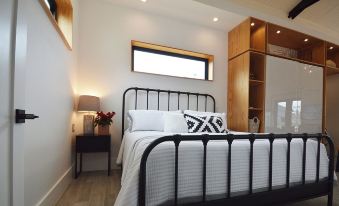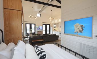 A simple standing-seam metal-paneled studio exterior belies the modern farmhouse interior that our guests have enjoyed over the years. The “one bedroom studio” space has a singular 18’ high vaulted ceiling with an exposed metal truss, multiple lighting options on dimmer switches, full bath, full size washer/dryer laundry niche, and large modular sofa sitting and dining work area – translating to an open and comfortable living, working, dining, sleeping experience.