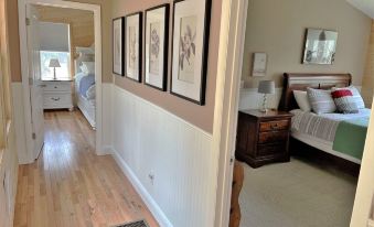 The guest suite offers a queen bed and direct access to a bathroom with a tub/shower combination (also accessible via a hallway).