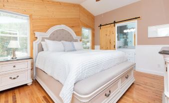 Inside, hardwood floors and warm wood walls create a rustic-chic vibe, while large windows throughout flood the home with natural light. Highlights include two Smart TV's, a stone fireplace, black-out shades, and a full kitchen.