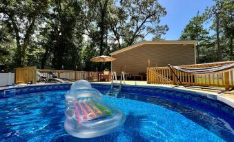 The backyard is a private oasis with a pool, perfect for cooling off on warm days. Enjoy the outdoor dining area, sun loungers, BBQ grill, fire pit, and hammock.