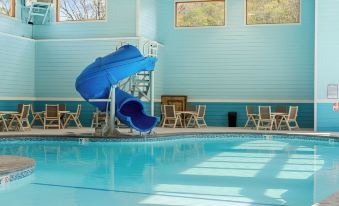 The cabin offers both indoor and outdoor swimming pools, ensuring you can enjoy a swim no matter the weather. The outdoor pool is surrounded by lounge chairs, creating the perfect space to soak up the sun and enjoy the surrounding natural beauty. The indoor pool is available year-round, providing a heated swimming experience even in the colder months. Both pools are perfect for playing with the kids or simply relaxing by the water. A hot tub is located next to the pool.