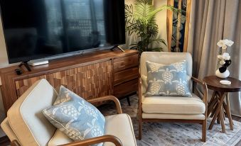 The living & sleeping area split space – a cozy loveseat is located at the foot of the queen size bed (sleeps 2), paired with 2 mid-century modern chairs, plus a 65” flat screen smart TV, atop a boho-modern, Acacia wood media console with extra storage for clothing. Other unique touches include a decorative, traditional wooden surfboard, coffee table books, full length mirror & bamboo luggage rack.
