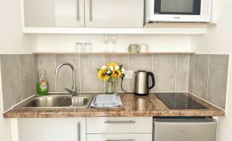 The kitchen’s got everything you’d need—hob, Panasonic microwave, fridge freezer, and all the usual cooking bits.