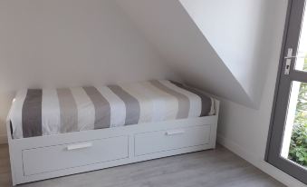 On the ground floor, a living room, tv, kitchen with oven, microwave, fridge, induction hob, dishwasher. Upstairs, a bedroom with a double bed and a trundle bed (sleeps 2) bathroom with shower, washer-dryer,