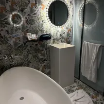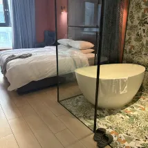 Perfect hotel in regard to location, surrounded by countless restaurants and active night life. Amenities were spotless. I loved the bathtub in .. the bedroom.