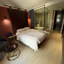 The room is spacious and clean. Bedding, towels, and bath rope are like new. The bed is huge, mattress is firm. Shower was one of the best. The shower itself is spacious. Water is very hot and with good pressure. One good design is shower, toilet and sink are separated by glass doors. People can get ready at the same time. There are lots of restaurants in the area just downstairs. If you really have to pick something, people are singing on the street pass midnight on Friday night. But it didn't bother me at all.