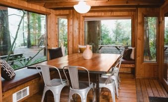 There is a shared bath house that includes indoor and outdoor showers and a sauna for the Eagles Nest and Lily Pad cabins. Each cabin offers a unique rustic charm, complete with wall-to-wall picture windows and wood-burning fireplaces.