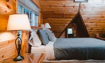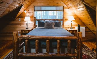 The cabin to the right when exiting from the French doors is called the Eagles Nest and has a queen size bed in the sleeping loft. The larger cabin to the left is called the Lily Pad, and includes a queen size bed in the loft and a comfortable sofa bed on the main floor.