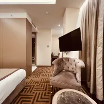Cet hôtel est situé dans la Corne d'Or, dans le quartier européen d'Istanbul, à seulement 3 minutes à pied d'une gare routière. J'ai réservé une suite de luxe avec vue sur la mer et balcon. La chambre est au quatrième étage. Elle n'est pas grande. Il n'y a pas du tout de 43 mètres carrés marqués. Les installations sont anciennes et très moyennes. Le soi-disant "luxe" signifie le luxe d'un grand balcon. Depuis le balcon, vous ne pouvez voir que la Baie de la Corne d'Or. Le petit déjeuner était plutôt bon et il y avait un nid d'abeilles.