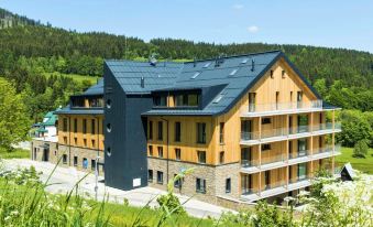 Petite résidence confortable, individuelle de 5 étages, année de construction 2023. Dans la localité, à 500 m du centre, situation ensoleillée, à 150 m du domaine skiable. Infrastructures de la Maison: local pour les skis, chauffage central. Garage individuel. Magasin d'alimentation 300 m, restaurant 50 m, arrêt de bus "Janské Lázně - Lesní dům" 200 m, gare ferroviaire "Svoboda nad Úpou" 3.8 km, parc "Farmapark Muchomůrka" 1 km, piscine 7 km, piscine couverte 300 m. Terrain de golf (18 trous) 7.5 km, tennis 1 km, golf miniature 4.5 km, chemins de randonnées pédestres depuis la maison, piste cyclable 100 m, télésiège, télécabine, pistes de ski, location de ski 150 m. Arrêt du ski-bus 200 m, école de ski, école de ski d'enfants, piste de luge 150 m, ski de fond 300 m. Attractions à proximité: Lanovka na Černou horu 100 m, Janské Lázně Spa, Stezka korunami stromů 700 m, bobová dráha 5 km, Pec pod Sněžkou, Relaxpark, bobová dráha 15 km, Vrchlabí 10 km, Trutnov 12 km, Malá Úpa 20 km, Zoo Dvůr Králové, Adršpach 35, Karpacz 40 km. Les domaines skiables de renommée sont facilement accessibles: SkiResort ČERNÁ HORA - PEC, Mladé Buky 5 km, Horní Malá Úpa 16 km, Špindlerův Mlýn 30 km. Région de randonnées: krkonošské naučné stezky. Veuillez noter: adapté(e) aux familles.