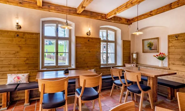 Wir sind eher zufällig ins Restaurant des Hotels Kortus gegangen, nachdem wir unsere Wandertour beendet hatten. Das Ambiente lud zum Verweilen ein und das Servicepersonal war schon zu Beginn überaus freundlich. Ich hatte das Hirschsteak mit glasierten Möhren und Zwiebelpüree, was überaus lecker war! Die Qualität der Speisen war ebenfalls hervorragend und das Preis-Leistungs-Verhältnis sehr gut! Es gibt einen Kinderstuhl, allerdings liegen die Toiletten im Hotel, welche nur über eine Treppe erreichbar sind (keine Barrierefreiheit). Hotel-Parkplätze sind nur begrenzt vorhanden. Ein kostenpflichtiger Parkplatz liegt allerdings vor dem Hotel. Da uns das Essen so überzeugt hatte, sind wir am nächsten Tag erneut dort essen gewesen. Kurzum: Es hat ein zweites Mal vollständig überzeugt! Dieses Mal hatte ich als Vorspeise Carpaccio, als Hauptspeise die Rippchen und als Nachtisch Žahour mit Vanilleeis. Auch dieses Mal war das Servicepersonal sehr freundlich (auch unseren Kindern gegenüber). Bemerkenswert war, dass es kein Problem war, Speisen auf zwei Teller für unsere Kinder aufzuteilen, da es keine Kinderkarte gab und eine normale Portion zu groß gewesen wäre. Wir können das Restaurant absolut weiterempfehlen!