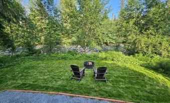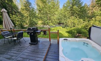 The large deck has a table for two, BBQ and hot tub over looking the river. In the yard you will find two chairs to relax in while enjoying the firepit or just soaking up some sun, listening to the river.