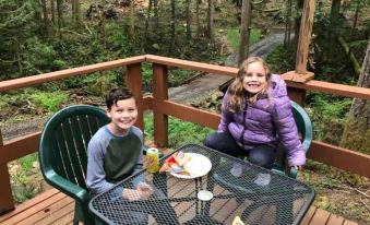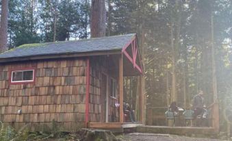 This is what people are talking about! Located on a small hill above Jordan Creek, this cool cabin has an outside deck overlooking the creek and surrounding forest. A perfect place for a getaway for a couple or a few friends. Cool LED lighting, clean and crisp décor. This place offers a refreshing yet rustic accommodation. This willl meet anyone's demand for rest and relaxation. It has all the amenities, new pit toilet with interior LED lighting, private outdoor propane insta-hot shower and totally cool adjacent tent site with water, picnic table and fire circle. Located in a stand of recently thinned 80 yr old firs and backed by the stunning vertical cliffs of Deer Mountain. This place is a must see.