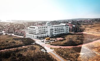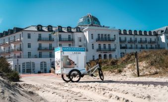 Direkt an der Düne liegt das imposante Grandhotel. Der "weiße Saal" ist wunderschön restauriert. Zu Abend haben wir dort nicht gegessen, aber das große Frühstücks-Buffet ließ keine Wünsche offen. Von der Glaskuppel aus, hat man einen tollen Blick über die Insel. Man blickt von dort aus gleichzeitig auf die Nordsee und das Wattenmeer. Schade, dass es dort oben kein Café gibt. Man könnte dort wunderbar verweilen. Das Schwimmbad ist zwar klein, aber schön. Man blickt beim Schwimmen auf die Dünen. Der Sauna-Bereich mit 4 verschiedenen Saunen ist nicht ganz optimal, aber in Ordnung. Das ist sicherlich der Architektur des alten, historischen Gebäudes geschuldet. Wir hatten eine frisch renoviertes Apartment im Scandic Style mit Terrasse zur Südseite. Selbst an trüben Tagen war es hell und lichtdurchflutet. Die Ausstattung war sehr hochwertig und mit schöner Kunst ausgestattet. Das Bett war ein Traum. Toll auch, dass es eine gut ausgestattete Küchenzeile gab, in der man selbst auch schnell mal ein paar Nudeln kochen konnte. Das Bad war zwar ohne Tageslicht, dafür aber tipptopp saniert und mit einer barrierefreien schönen Regen-Dusche ausgestattet. Das Personal an der Rezeption war wirklich freundlich und immer hilfsbereit. Für gehbehinderte Personen oder auch für Kinderwagen müsste man vielleicht im Vorfeld daraufhin weisen, dass es auch einen ebenerdigen Nachteingang mit Aufzug gibt. Insgesamt hat es uns so gut gefallen, dass wir auf jeden Fall nächstes Jahr wieder kommen möchten.