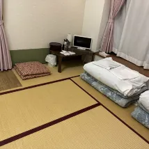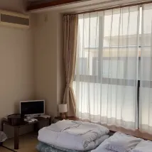 It's definitely a hidden gem. One station away from the Shonan Monorail via the iconic green/yellow Enoshima Electric Railway. The room is large enough for 4 persons in a 3 person side-by-side and 1 person tangent to the others. Our tallest person is 6'-1" for reference. There's a small cute TV good for checking out the weather. We settled in on the 3rd floor and there are two other rooms I believe, sharing two baths and two toilets. Never managed to run into any other guest going to the bathroom. It takes about 10 to 15 minutes walking to the enoshima island bridge. There is a cute restaurant downstairs. The owner/manager is such a delightful person! If you ever want to experience the traditional Tatami for a night or two, this is the place for you.
