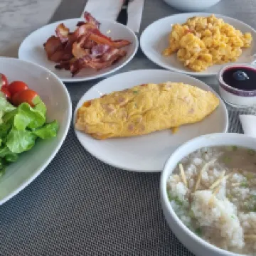 Asian pdj, toast and some cakes for those who do not like it. Cook who makes eggs and omelette.