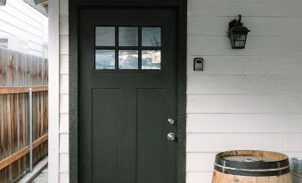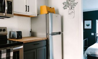 Step inside our thoughtfully designed studio unit, complete with a full kitchen, cozy bedroom, and two comfortable sitting chairs. The space exudes a rustic farmhouse ambiance, boasting brand new butcher block countertops, stylish kitchen appliances, and inviting wood floors. Delight in the charming details such as the wine barrel dining table, porcelain sink, and warm wood accents, creating an atmosphere that feels both nostalgic and welcoming.