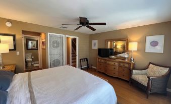 #1 at the Foundry is a three story home. On the first floor, you'll find the spacious living, kitchen, and dining areas, along with a half bath. High ceilings make the space feel even larger. Up the stairs, you find the primary bedroom which has a king sized bed and French doors leading to a patio that overlooks peaceful Front St. There is an en suite bath and laundry on this floor. The top floor is home to another private bedroom with a queen sized bed and en suite bath. Each bedroom has a TV.