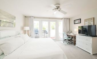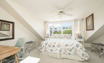 Second Floor: Relax in the spacious primary suite featuring a king bed, flat-screen TV, work desk, ample storage, and a private balcony perfect for morning coffee. The ensuite bath includes a shower and bathtub. Laundry facilities are also located on this floor.