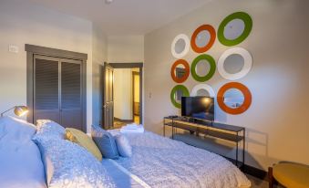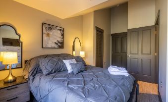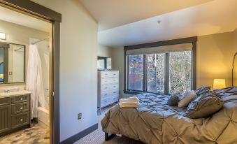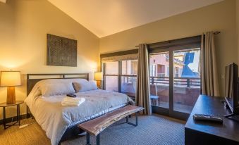 At the entryway you will find hooks and a bench for jackets and shoes. Your private ski locker in the parking garage offers convenient storage for all your ski and snowboard gear while coming and going throughout the day. The main living and dinning area is open plan with a gorgeous quartz slab island with seating for 4 and a separate dining table for 8. The kitchen has stainless steel appliances and is stocked with essential cookware and tableware. The living room features modern furnishings, a flat screen tv, and gas fireplace. There are two balconies, one off of the living area and the other off of the master bedroom.
