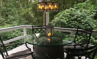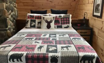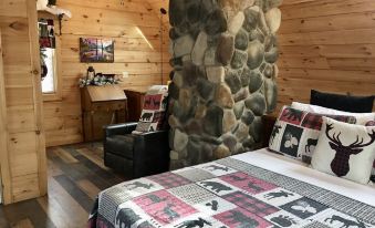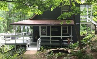 Bathe in the peace of nature's embrace, enjoy serene views, seclusion, stargazing in the hot tub, & the crackling of a wood burning fire. Loft bedroom w/ queen bed and skylights, futon in living room, full bathroom, kitchenet, wood burning fireplace, covered porch, fire ring, hot tub, 2 32" TV's, wireless internet, outdoor water feature.About pets:No pets allowed.3 friendly Newfoundland dogs reside on property..About checkOut:Check out before 11:00 AM.About children:Children allowed: ages 3-17.About customRules:No standing on hot tub cover or deck railings. Hot tub cover must be on when not in use. Please do not put oils, fragrance, etc. in the hot tub..No eating or smoking in the hot tub. No glass in hot tub. Children under 18 must be supervised by an adult while in the hot tub.,Don't leave indoor or outdoor fires unattended. No open flames inside other than in fireplace. No fireworks of any kind. No smoking in the cabin..About checkIn:Check in after 4:00 PM.About smoking:Smoking is not permitted.About minBookingAge:Minimum age to rent: 25.About events:No events allowed.