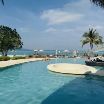 Nous avons passé une nuit et nous nous sommes surtout reposés sur place. Excellent emplacement, sur la plage du lever du soleil et ensuite on peut marcher jusqu'à la plage du coucher du soleil le soir qui est à proximité, plage moins fréquentée. Le service du personnel de l'hôtel est également excellent 😁 Le petit-déjeuner et le déjeuner que nous avons commandés étaient bons..
