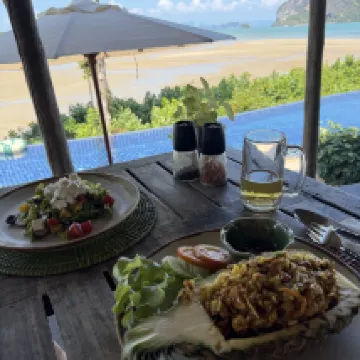 Le meilleur hôtel de notre voyage en Thaïlande. Dès notre arrivée, nous avons été fascinés par la magnifique vue. L'accueil a été très sympathique et on s'est immédiatement senti le bienvenu. Les chambres sont toutes dans leurs propres bungalows, joliment meublés, très propres et dotés d'une immense terrasse. Les bungalows sont situés directement dans la jungle, avec une vue magnifique directement depuis le lit. Il y a 2 piscines. Le plus petit est assez vieux et n'est utilisé que par quelques vacanciers. La piscine principale avec bar de la piscine et juste à côté du restaurant est géniale ! Encore une vue unique ! Le personnel de l'hôtel est très arrangeant, notamment Ochi à la réception.