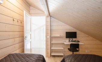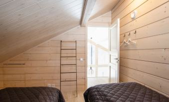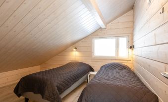 4 bedrooms, two are on the upper floor and two on the ground floor. One bedroom has a double bed (160x200cm) and all others have separate beds (80x200cm) that can be attached as double beds. The bedrooms on the upper floor have sloping ceilings. The second upper floor bedroom also has a desk for remote working. On the ground floor, spacious living room/kitchen and laundry facilities; electric sauna and two showers. In addition, utility room and separate WC. Another toilet on the upper floor as well. Access to the terrace from the utility room.