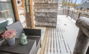 40 km north of Kolari, Lake Äkäslompolojärvi 2.5 km, swimming shore 2.5 km. Silverlog row house apartment 2012. Area 78 m² of which 19 m² on the loft. Living room/kitchen, 2 bedrooms, both with 2 separate beds, in sleeping loft 2 separate beds, sauna (electric stove), 2 separete wc (another on sleeping loft). No pets allowed in apartment. Pets are prohibited for maintenance reasons. However, there have been pets in the cottage, and it is therefore not suitable for people with animal allergies. Ski maintenance room in shared use in the basement.