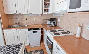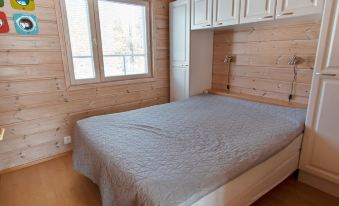 40 km north of Kolari, near the Äkäslompolo village skiing tracks, address Maahisentie 5. Log duplex apartment (built 2007) that has livingroom/kitchen with bed sofa, bedroom with double bed, loft (20 m²) with two beds ( 80 x 200 cm), 1 bed ( 120 x 200 cm) and sofa + matress, electric sauna, separate toilet and heated ski maintenance space. Area 65 m² of which 20 m² on the loft. Location is a peaceful place on the side of the fell. Skiing routes accessible directly from the ski maintenance room and it's possible to come down from the Ylläs-Ski slopes straight to the cottage. Hiking routes also accessible from the yard during summer. No pets allowed. In addition: two TVs (TV in the livingroom has a card reader, the other TV is on the loft). Table ware for 8 people. 3G-network for wireless broadband connection. Nursery equipment (potty, feeding chair and travel bed).