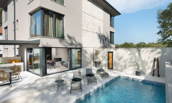 Maison jumelée moderne "Oliva 1", de 4 étages, année de construction 2017. Dans le hameau de Križine, à 4 km du centre d'Umag, situation tranquille, ensoleillée, à, de la mer, à 200 m de la plage. En commun: terrain 2'000 m2 (clôturé), beau jardin avec pelouse et plantes. Espace de jeux pour les enfants (toboggan, balançoire). A usage privé: terrain 100 m2 (clôturé), piscine rectangulaire, chauffée (8 x 4 m, profondeur 140 cm, disponibilité saisonnière: 01.Jan. - 31.Dec.) avec marches intérieures. Douche extérieure. Infrastructures de la Maison: accès internet, billard, baby foot, chauffage central, lave-linge, sèche-linge. Place de parking (pour 2 voitures) près de la maison sur le terrain. Borne de recharge électrique. Magasins 300 m, supermarché 3 km, restaurant 300 m, arrêt de bus 400 m, plage de graviers, plage de rochers 200 m. Terrain de golf (18 trous) 12 km, tennis 4 km, centre équestre 5 km, chemins de randonnées pédestres depuis la maison 100 m, piste cyclable 150 m. Groupes de jeunes non autorisés. Piscine chauffée (en sus).
