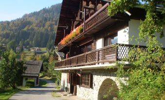 80m² apartment, 'cozy' atmosphere on the 1st floor of a typical Savoyard chalet with 2 apartments. Located 500m from the village center, 100m from the ski slopes, at 38 Michelin road in the Riffroids district. View of the Aravis range, the Etale and Beauregard mountains, and the ski slopes. private garden with pond.