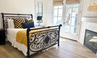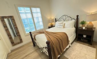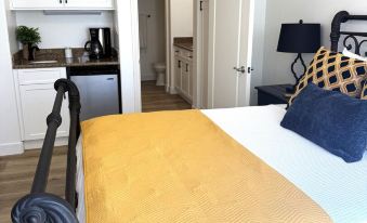 Queen Suite: A large bedroom with French doors that opens onto a private patio. Queen size bed with linens. un-suite bathroom features a soaking tub and separate shower. Flat screen smart TV, Closet , ceiling fan, wet bar/coffee station, under cabinet refrigerator. Personal Climate control.