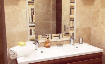 Bathroom with double sink, walk-in shower, heated towel rail and hanging toilet.