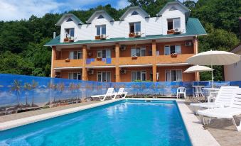 Отель находится на краю поселка Лазаревское, в отдалении от шумного центра и переполненных пляжей. В шаговой доступности пляжи на выбор: от элитного Одиссея, до дикого и нудистского. За полчаса можно без спешки дойти до моря, выкупаться и вернуться обратно. В отеле для отдыха на пляже можно брать зонтики, коврики. Все - бесплатно. Бассейном не пользовались. Инфраструктура возле отеля скромная, но есть: овощная лавка, круглосуточный магазин, столовые. Хороший ресторан Veranda. До вокзала на такси ехать примерно 10 минут, цена поездки от 130 до 300 рублей в зависимости от спроса. Номера в отеле чистые, мебель скромная, матрасы хорошие при этом. Самое слабое место в номере - санузел. Конечно, нужно дооборудовать его: добавить держатель для туалетной бумаги, сменить зеркала, стаканчики под зубную пасту/щетки тоже нелишние). Столовая произвела смешанное впечатление. С одной стороны, удобно питаться там, где живешь, экономя время. С другой - трехразовое питание на человека обойдется в сутки 1100-1200. Ассортимент блюд широкий, каждый что-то сможет для себя выбрать по вкусу. В целом отдыхом в данном отеле мы остались довольны.