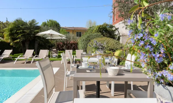 Dejligt hotel i centrum og i gåafstand til byen, 3 min. Fine værelser og sødt personale. Lille hotel med fine og hyggelige faciliteter, skøn have med pool til.