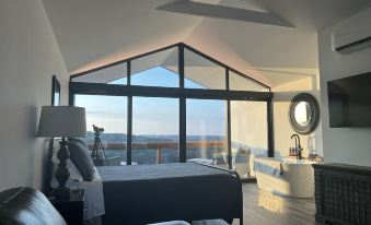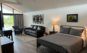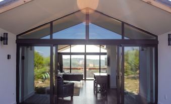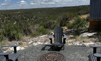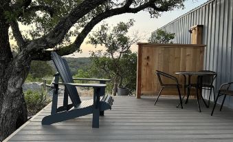 Ferruginous Pygmy (Fergy for short) is a tidy open concept single room cabin designed with custom "window walls" at entry and on the back balcony, allowing you to see completely through the cabin to the lovely hills beyond. When you stay at Fergy, you experience a beautiful balance of out and in. Enjoy the cozy and comfy interior and the expansive exterior that epitomizes the Texas Hill Country.