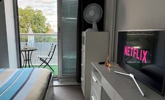The apartment has 1 bedroom, a flat-screen TV with streaming services, a fully equipped kitchen with a dishwasher and an oven, a washing machine, and 1 bathroom with a bath. A private entrance leads guests into the apartment, where they can enjoy some chocolates or cookies. A dressing room and laundry service is also available.