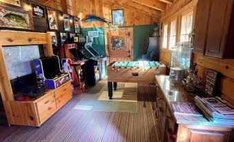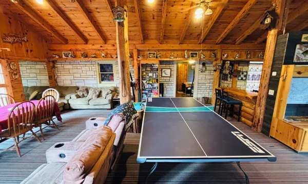 The cabin itself is sprawled out giving everyone plenty of space and it’s not cramped like most of the cabins in the area. The entire property is 1 acre and its completely fenced in for dogs. Great WIFI signal for the area. Large game room is where most people like to congregate for some competitive ping pong, darts, bags, board games or some classic arcade games (over 400). Have bags, floatable’s, water trampoline, axe throwing, spike ball, lawn darts and 4 cross for outdoor entertainment. Two large fire pits in the back yard, one lakeside and one closer to the back patio. Picnic table and giant spool by lakeside fire pit. Two grills available for outdoor cooks. Neither is gas. I have a large Weber charcoal and a large green egg that I use primarily for smoking. It’s the best way to cook on vacation. Put some ribs on the grill, go out and enjoy your day on the water and come back home to a tasty dinner. Property has two kayaks that come with the rental. Fishing boat and pontoon boat also available for rent.