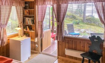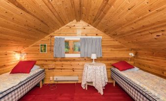 In a separate sleeping cottage (35 m2, can be used year-round) there are two bedrooms with 2 beds in each, one bedroom downstairs and one bedroom upstairs. Electric heating, refrigerator, outdoor dry toilet (no indoor toile). To upstairs quite steep stairs (stairs are outside under the canopy). Sleeping cottage is located about 50 m from the main cottage.