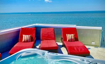 For Boat lovers you can buoy your boat right outside of the house and walk right to it off of the sand beach. it should be noted that the Bay depth in this area is no more then 3-4 feet at HIGH tide meaning you can Buoy you boat and walk to it up to 200 feet out and not have to swim. A rarity to have a sand beach on the bay that shallow instead of bulkhead and deep water! Awesome for young kids as the water does not drop off till you get to the channel hundreds of feet out and don't have to worry about the young ones being swept by waves in over their head. The Bay is calm and perfect to lounge around on one of the 2 Giant rafts offered or take a swim in the warm waters. The house also comes with a 5 person paddle boat, 7 kayaks, 18 bikes, 4 stand up paddle boards, boogie boards, Crab traps, Fishing poles, and lots of floats and tubes. We even provide you with 10 beach chairs, 2 umbrellas, and 2 beach buggies to cart all your gear in.