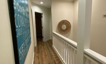 Two bedrooms are located upstairs, each with their own private bathroom. The master bedroom features a king bed with custom closet and flat screen TV. The attached newly renovated bathroom offers a stand up shower and new dual-vanity sink.