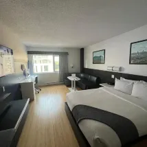 Bel hôtel! Bien situé près de Montréal. La chambre était spacieuse avec toutes les commodités (je n’ai manqué de rien et il y avait même un coin dînette et un bureau avec ordinateur). Très pratique le petit déjeuner inclus. Chambre refait à tous les jours avec nouvelles serviettes. Stationnement privé et sécurisé par une barrière.