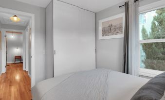 The master bedroom includes a Casper queen-size bed, an ensuite bathroom with a walk-in shower, and a large walk-in closet. The guest bedroom features a Nectar queen-size bed and a built-in closet. Both bedrooms include high-end mattresses and Brooklinen sheets.