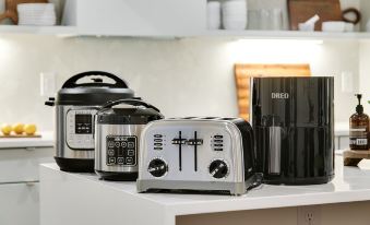 - Fully stocked & equipped kitchen w/air fryer, Ninja Blender, Rice Cooker, InstaPot, and more