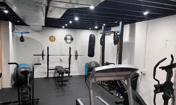 The home features a covered deck and a home gym in the basement that has a treadmill, elliptical, assault bike, weight bands, free weights, and other equipment.